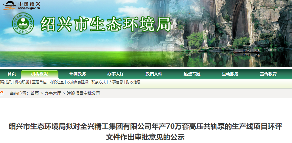 紹興市生態環境局發布擬對全興精工集團有限公司年產70萬套高壓共軌泵的生產線項目環評文件作出審批意見的公示。