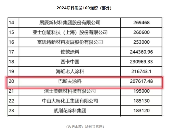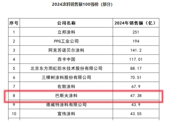 作為涂料領域極具專業性與權威性的新媒體服務平臺,涂料采購網近期發布的2024涂料行業“最賺錢”的100家企業和涂料銷量100強企業排行榜,引發了行業內外的高度關注。在這兩份備受矚目的榜單中,巴斯夫涂料憑借卓越的市場表現脫穎而出,交出了一份令人矚目的成績單:以47.38億元的銷售額與21.67萬噸的銷售量,同時強勢躋身第8位與第20位,彰顯出其在涂料行業強大的綜合實力與市場競爭力。