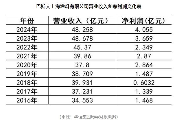 巴斯夫在華合資企業業績呈現新變化。盡管2024年我國汽車、乘用車、新能源汽車產銷量實現了增長,但由于巴斯夫涂料部分汽車制造商客戶在華產銷量下滑,影響了其涂料需求。根據華誼集團4月21日發布的2024年報,巴斯夫上海涂料有限公司2024年實現營業收入48.258億元人民幣,同比略降0.9%;凈利潤逆勢增長10.82%,達到4.055億元人民幣。
