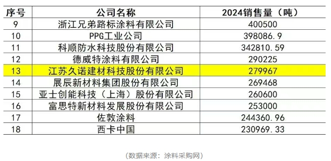 而市場對于優質創新產品的反饋,往往最能說明其價值與潛力。近日,作為涂料領域極具專業性與權威性的新媒體服務平臺,涂料采購網近期發布的2024涂料銷量100強企業排行榜,引發了行業內外的高度關注。久諾以27.99萬噸的驕人銷售業績強勢上榜,位列第14名。在數據與實力的雙重見證下,久諾的“超耐久”能否成為改寫行業未來的關鍵力量?