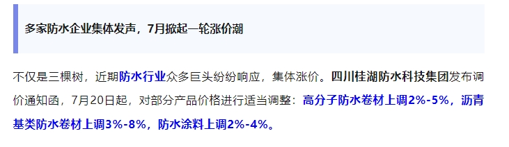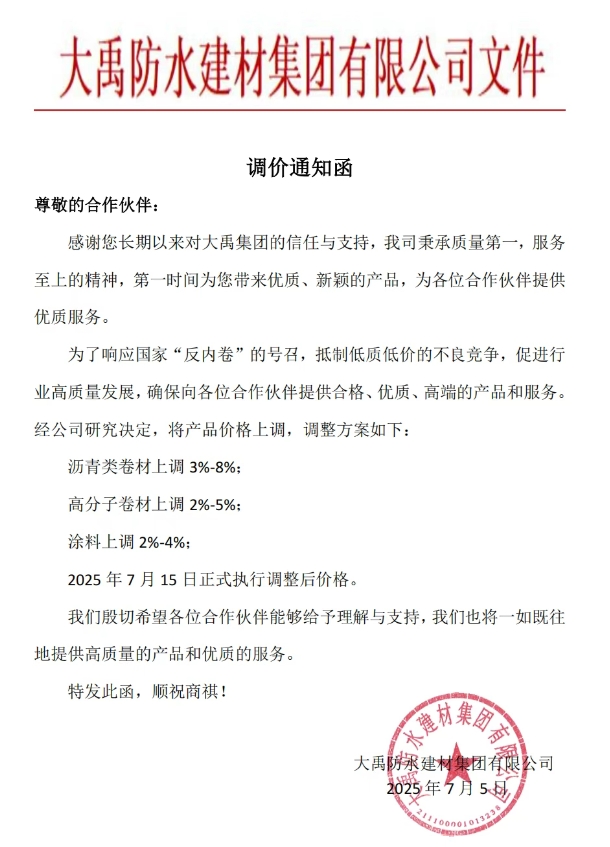 大禹防水宣布,7月15日起瀝青類卷材上調3%-8%、高分子卷材上調2%-5%、涂料上調2%-4%。