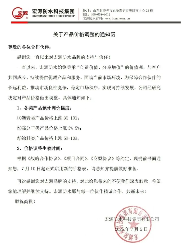 宏源防水科技集團發布通知函,經研究決定對產品價格做出調整,7月10日起,瀝青類產品價格上漲3%-10%,高分子類產品價格上漲3%-5%,涂料類產品價格上漲5%-10%。