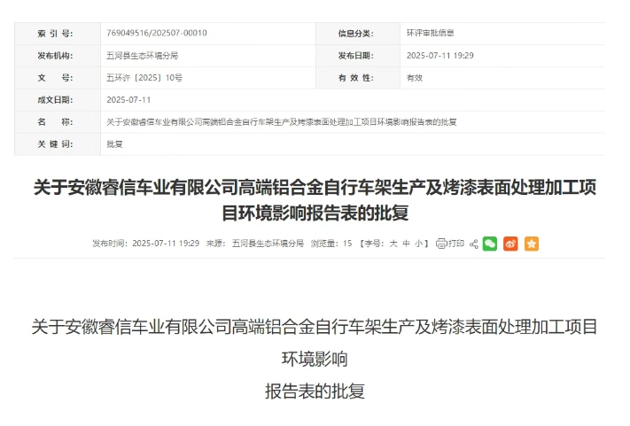 你公司報送的《安徽睿信車業(yè)有限公司高端鋁合金自行車架生產(chǎn)及烤漆表面處理加工項目環(huán)境影響報告表》(以下簡稱《報告表》,項目代碼2410-340322-04-01-522193)收悉。經(jīng)認(rèn)真研究,現(xiàn)批復(fù)如下: