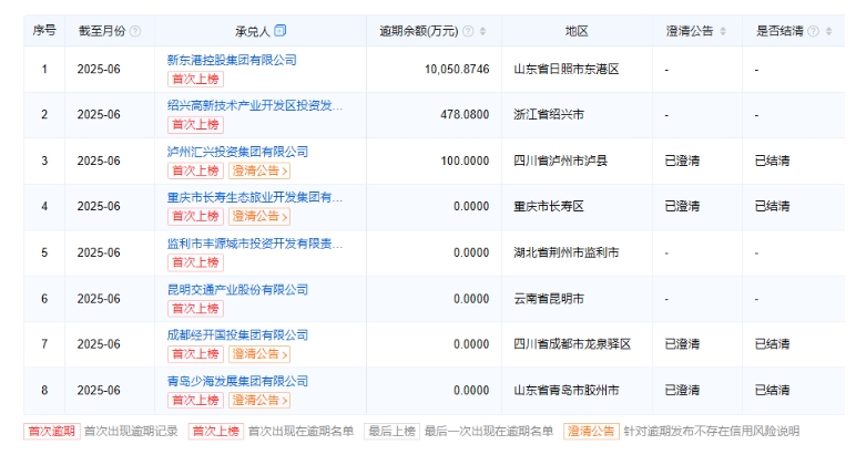 其中, 8家發(fā)債城投公司為首次上榜,分布在山東、浙江、四川、重慶、湖北、云南六省。新東港控股集團有限公司逾期余額為10050.8746萬元;紹興高新技術產業(yè)開發(fā)區(qū)投資發(fā)展集團有限公司逾期余額為478.08萬元。