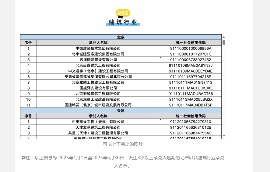 記者統(tǒng)計了 2025年1月1日至2025年6月30日,發(fā)生3次以上承兌人逾期的地產以及建筑行業(yè)承兌人名單,這些曾經(jīng)風光無限的企業(yè),如今卻淪為被人指指點點,或將走向倒閉之路的“危樓”。