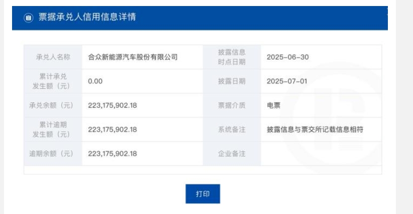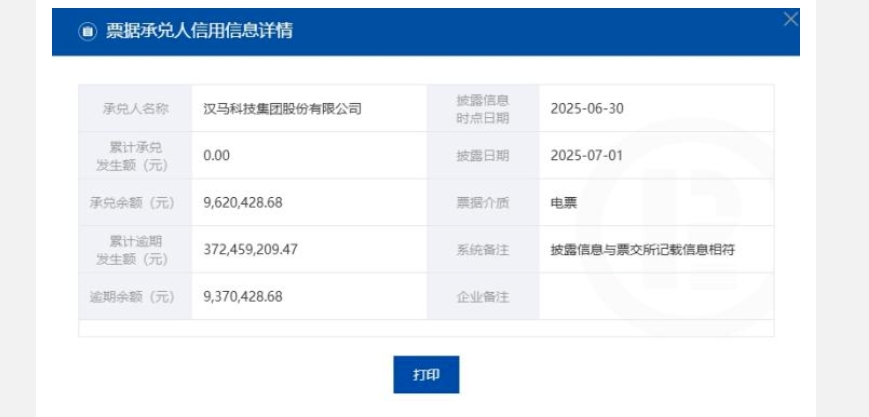 截至 6月30日,吉利集團旗下子公司漢馬科技逾期余額為937.04萬元, 累計逾期發(fā)生額達 3.72億元。票交所已暫停其商業(yè)匯票承兌服務權限,企業(yè)須清償全部逾期票據(jù)并完成信用修復流程后方可申請恢復。