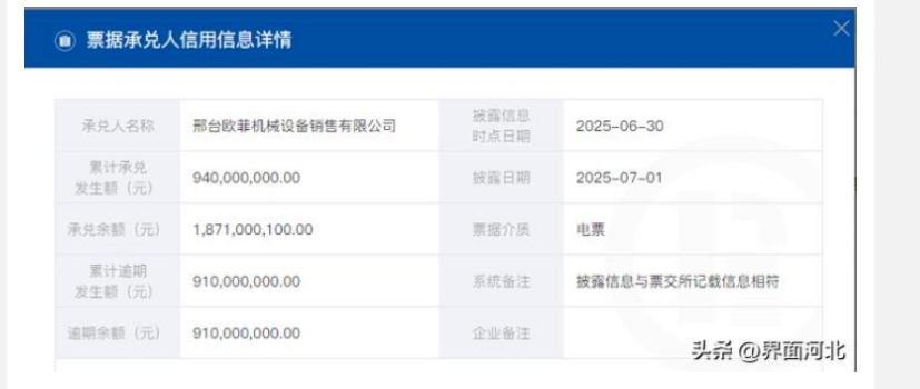 工程機械領域, 截至 2025年6月30日,邢臺歐菲機械累計逾期發(fā)生額為9.1億元, 逾期余額為 9.1億元。