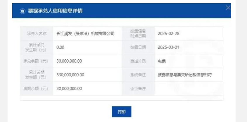 據(jù) 3月份數(shù)據(jù), 長江潤發(fā)(張家港)機械有限公司 累計承兌金額 3000萬元,全部逾期未兌付。更嚴重的是,其歷史累計逾期金額已高達 5.3億元,目前票據(jù)新增承兌為0.業(yè)務疑似全面停滯。