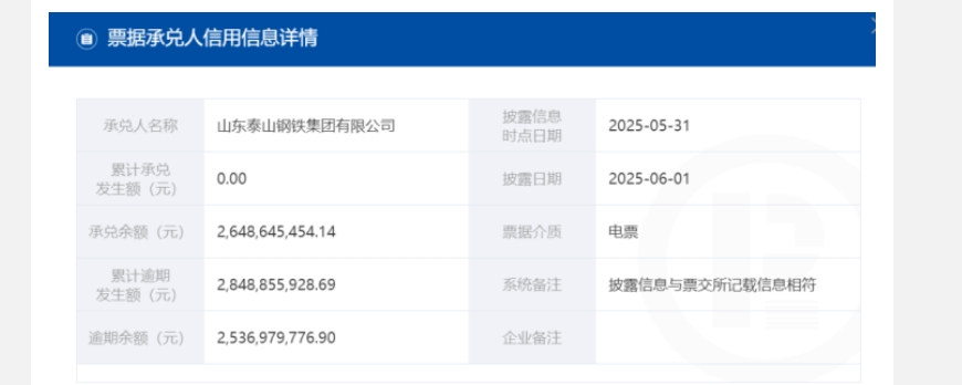 鋼鐵行業(yè),知名企業(yè)山東泰山鋼鐵不幸 “淪陷”。 截止 2025年6月1日,山東泰山鋼鐵集團有限公司的商業(yè) 承兌匯票逾期余額已達 25.36億元,承兌余額為 26.48億元。