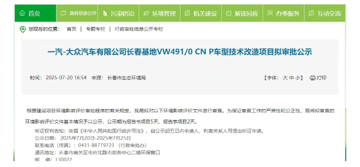 近日,長春市生態環境局發布一汽-大眾汽車有限公司長春基地VW491/0 CN P車型技術改造項目擬審批公示。