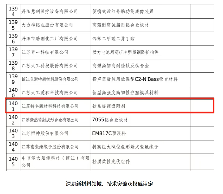 近日,江蘇省工業和信息化廳正式公示 2025 年度江蘇省 “三首兩新” 擬認定技術產品名單。經過嚴格規范的評審流程,江蘇特豐新材料科技有限公司(以下簡稱 “特豐新材”)自主研發的核心產品 ——“鈦系提鋰吸附劑” 成功躋身 “兩新” 技術產品目錄。這一重要成果不僅是對特豐新材在新能源材料領域技術創新實力的權威認證,更標志著企業在關鍵材料自主研發賽道上的核心競爭力實現了新突破,為其深耕新能源產業、推動技術成果產業化奠定了堅實基礎。