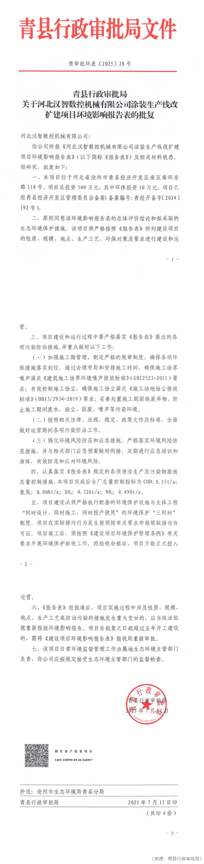 近日,青縣行政審批局發布關于對河北漢智數控機械有限公司涂裝生產線改擴建項目環境影響評價文件作出審批決定的公告。