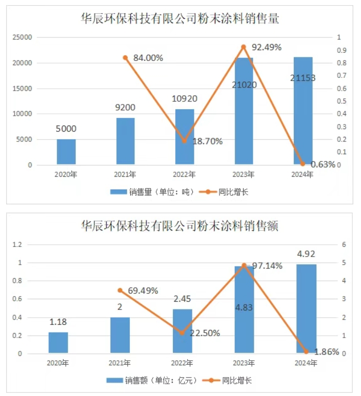 2025年6月,涂料行業專業的新媒體服務平臺涂料采購網正式發布了“2024年粉末涂料銷售額&銷售量榜單”。華辰環??萍加邢薰?以下簡稱華辰塑粉)以4.92億元銷售額位列銷售額100強榜單的第10名,以21153噸的銷售量位列銷售量榜單的第12名。