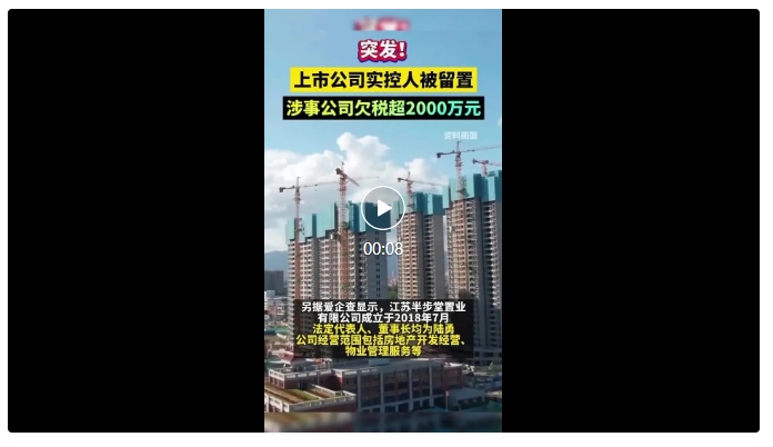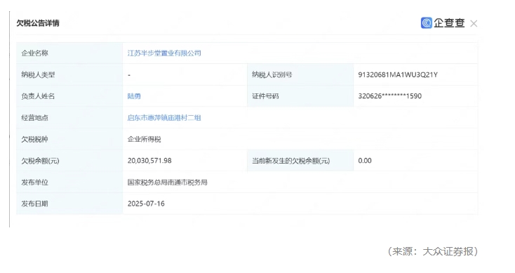 另據(jù)企查查顯示,江蘇半步堂置業(yè)有限公司成立于2018年7月,注冊(cè)資本5000萬元,法定代表人、董事長均為陸勇。公司經(jīng)營范圍包括房地產(chǎn)開發(fā)經(jīng)營、物業(yè)管理服務(wù)等。值得關(guān)注的是,國家稅務(wù)總局南通市稅務(wù)局于2025年7月16日發(fā)布一則欠稅公告信息,江蘇半步堂置業(yè)有限公司累計(jì)欠繳稅款總額超過2000萬元。