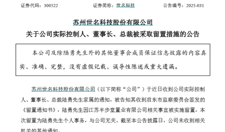 28日晚間,世名科技(300522)發(fā)布公告稱,近日收到公司實(shí)際控制人、董事長、總裁陸勇家屬的通知,被告知其收到啟東市監(jiān)察委員會(huì)簽發(fā)的《留置通知書》,陸勇因江蘇半步堂置業(yè)有限公司相關(guān)事宜被實(shí)施留置。