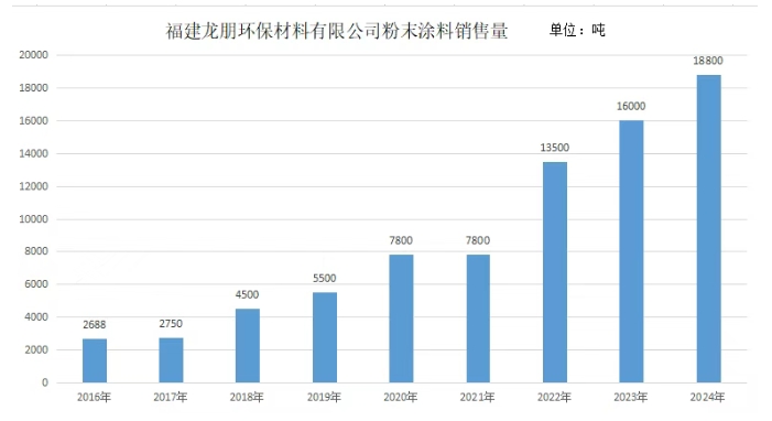 根據(jù)榜單,福建龍朋環(huán)保材料有限公司近十年銷售量均呈上升趨勢,2024年最新數(shù)據(jù)相較于2023年同比增長17.5%。回顧近10看看發(fā)展情況,2015年,龍朋環(huán)保的粉末涂料銷量僅為2688噸,而到了2024年,粉末涂料的銷量為18800噸,火箭式增長599%。