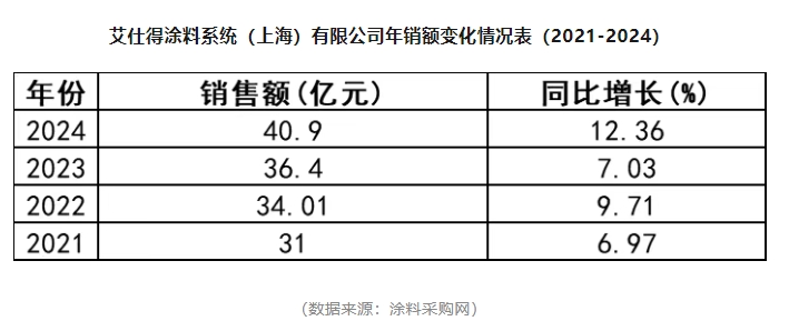 另據涂料采購網披露的數據,2024年艾仕得涂料系統(上海)有限公司實現銷售額40.9億元人民幣,不僅刷新歷史最高紀錄,更以12.36%的同比增速創下近四年新高。這一表現遠超2023年7.03%的增長率,展現出強勁的增長勢頭。