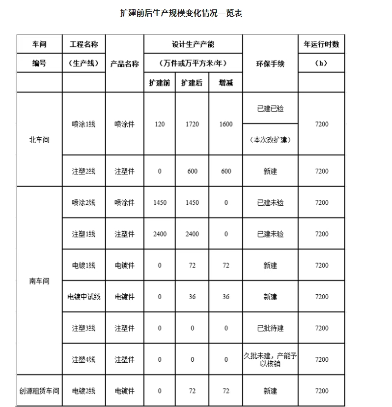 綜上所述,南通柏源汽車零部件有限公司共計批復產能為11550萬件/年注塑件、1570萬件/年噴涂件,共計驗收產能為2400萬件/年注塑件(已拆除)、120萬件/年噴涂件,剩余產能6750萬件/年注塑件暫未建設,2400萬件/年注塑件以及1450萬件/年噴涂件已完成建設投產(暫未驗收)。