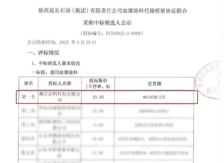 近日,湘江涂料捷報頻頻,接連中標了陜西延長石油(集團)有限責任公司油漆涂料代儲框架協議聯合采購項目、中國石油化工股份有限公司九江分公司150萬噸芳烴防腐涂料項目、惠州立拓新材料有限責任公司30萬噸/年聚烯烴防腐涂料項目等多個石油化工防腐涂料重大項目。