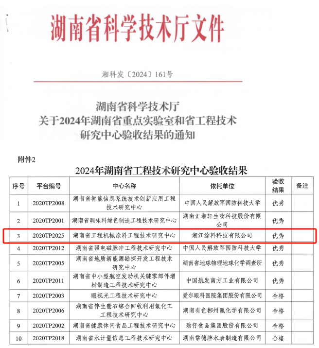 近日,湖南省科學技術廳公布了2024年湖南省重點實驗室和省工程技術研究中心驗收結果。經單位自評、專家會議評估、現場抽查、專題會議研究、廳黨組會議審議等程序,依托于我司的“湖南省工程機械涂料工程技術研究中心”通過驗收并被評為“優秀”,這也是湖南省唯一獲評優秀等級的涂料類省級工程技術研究中心。