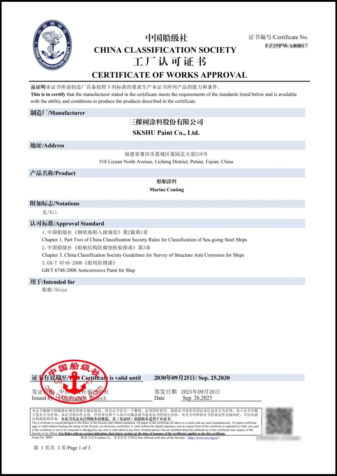 作為“工業防腐涂料皇冠上的明珠”,船舶涂料領域因技術門檻高、認證周期長、測試標準嚴苛,長期以來是衡量企業工業涂料研發實力的關鍵賽道。近日,國內涂料行業傳來重磅消息——三棵樹成功獲得由中國船級社(CCS)頒發的《工廠認可證書》!這一成果不僅是三棵樹正式進軍船舶涂料市場的里程碑,具備了為全球各類船舶及海洋裝備提供國際水準防護服務的核心資質,更標志著其在高端工業涂料征程上又邁出了堅實而關鍵的一步。