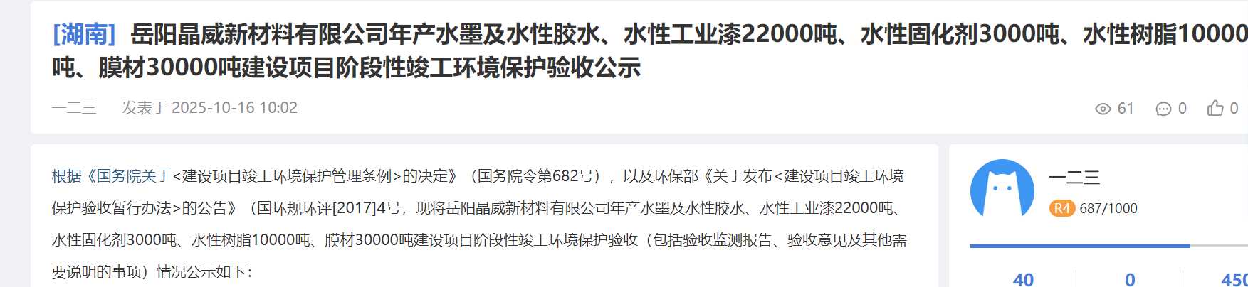 近日,岳陽晶威新材料有限公司《年產水墨及水性膠水、水性工業漆22000噸、水性固化劑3000噸、水性樹脂10000噸、膜材30000噸建設項目》進行環保驗收公示。
