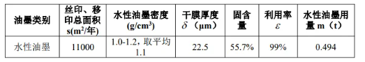 經核算,絲印、移印總面積約為11000m2.油墨厚度為20-25um,本項目取均值22.5um。水性油墨的密度為1.0~1.2g/cm3.取均值為1.1g/cm3.