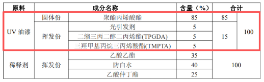 UV漆:項目油漆為UV漆;外觀為粘稠性液體;具有刺激性氣味;油漆密度為1.25g/cm3;主要成分為:聚酯丙烯酸酯80%~95%;二縮三丙二醇二丙烯酯(TPGDA)1%~5%;三羥甲基丙烷三丙烯酸酯(TMPTA)1%~5%;光引發劑0%~5%。不溶于水,可與丙酮、醋酸正丁酯等酮和酯類溶劑混溶。