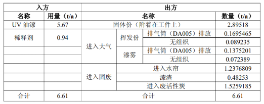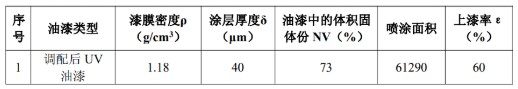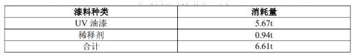 油漆、稀釋劑消耗量核算: 本項目使用的油漆為UV光固化漆。UV光固化漆使用時需添加稀釋劑進行稀釋后方可使用;油漆與稀釋劑的比例為6:1(重量比);油漆密度約為1.25g/cm3. 揮發份含量為15%,稀釋劑密度為0.86g/cm3.揮發份含量為100%。