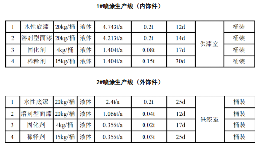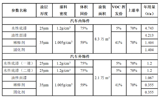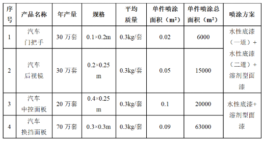 本項目主要將注塑車間冷卻定型的汽車零部件進行噴漆,噴漆后作為產(chǎn)品直接外售。項目產(chǎn)品分為汽車外飾件(汽車門把手、后視鏡)和汽車內(nèi)飾件(汽車中控面板、換擋面板),汽車外飾件噴涂方案為:水性底漆+水性底漆+溶劑型面漆(汽車外飾件需噴涂兩道底漆,使用同一種底漆,兩道底漆噴涂厚度保持不變),汽車內(nèi)飾件噴涂方案為:水性底漆+溶劑型面漆。