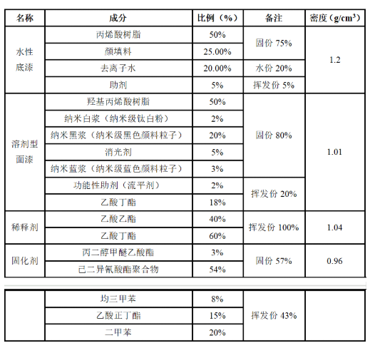 根據(jù)廠家提供MSDS,水性底漆密度為1.2g/cm3.水性底漆中揮發(fā)性有機物的占比為5%。