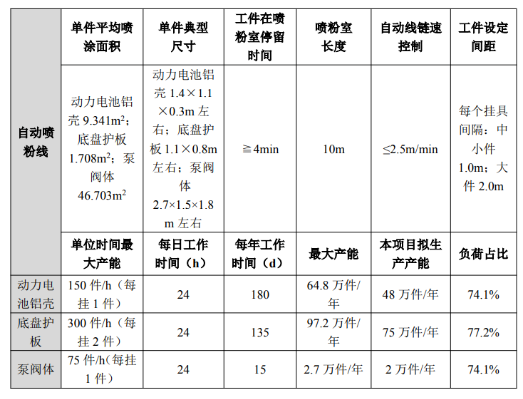 本項目擬設置一條粉末涂裝自動線,自動線中噴粉室設計10m長度,共有16支噴槍分布在噴粉室內,自動控制從不同角度進行噴涂,實現工件表面全覆 蓋涂裝作業。對于新能源汽車零部件的噴粉作業屬于中高精度需求場景,噴粉強度控制在一定范圍以內,可確保覆蓋面積和噴粉量達到設定的要求。根據平均單件噴涂面 積設計掛件在噴粉室中停留時間,再結合噴粉室長度設計情況,確定自動線鏈速控制范圍,最后根據掛件間間距設計分析噴粉生產線的生產能力。需要涂裝工件分配不同工作時間,總工作時間不超過330d,相關參數分析見下表。