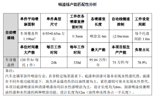 油漆用量核算 根據建設單位提供資料,項目需噴漆產品為89.700萬m2、噴粉產品為669.874萬m2、電泳產品為311.206萬m2.根據建設單位提供資料,本項目水性底漆、面漆、清漆和電泳漆均無需調配 使用。油性面漆需要調配后使用,油性漆:固化劑:稀釋劑的比例為1:0.5:0.4. 本項目噴漆產品涂裝為1層底漆+1層面漆+1層清漆,底漆漆層厚度為15μm、 面漆漆層厚度為20μm、清漆漆層厚度為30μm;電泳漆1層,漆層厚度為20μm。