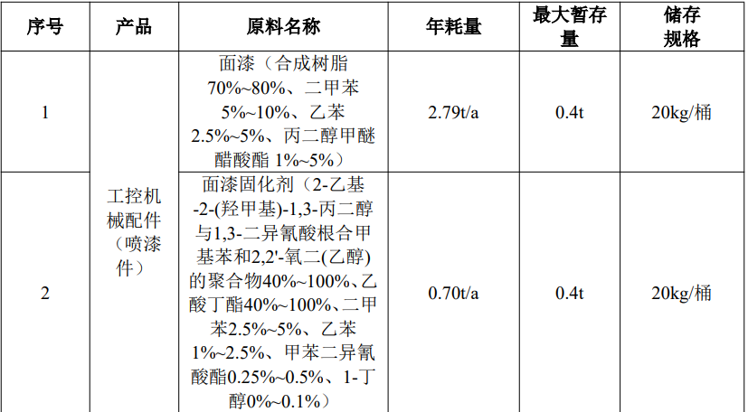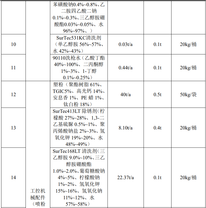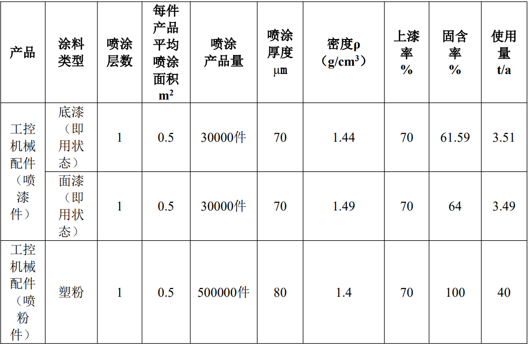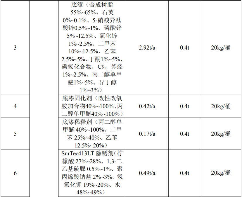根據上表核算內容,底漆與固化劑、稀釋劑按照7:1:0.4進行調配,面漆與固化劑按照4:1進行調配。項目使用的溶劑型涂料底漆(即用狀態下)年使用量為3.51t/a,面漆(即用狀態下)年使用量為3.49t/a。故底漆年用量為2.92t/a,底漆固化劑年用量為0.42t/a,底漆稀釋劑年用量為0.17t/a;面漆年用量為2.79t/a,面漆固化劑年用量為0.70t/a;塑粉年用量為40t/a。本次評價采用企業提供的MSDS中數據,按照底漆:固化劑:稀釋劑=7:1:0.4、面漆:固化劑=4:1的調配比例,確定本次工程使用涂料主要組分及揮發性有機廢氣(以非甲烷總烴計)占比情況。
