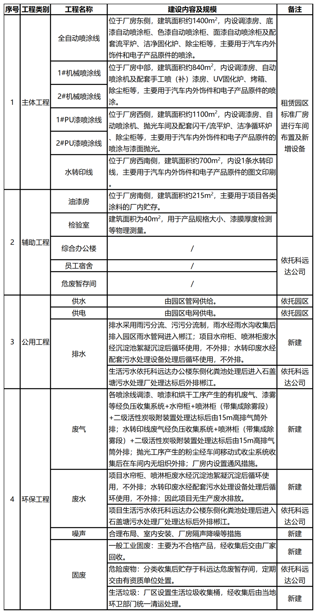 建設單位擬租賃郴州市經濟開發區石蓋塘片區標準廠房建設5條表面噴涂線、1條水轉印線,并配套建設調漆房、手工噴(補)漆房、環保設施等。項目建成運營后可形成年表面處理汽車內外飾件60萬件、電子產品原件45萬件、水轉印產品30萬件的生產能力。