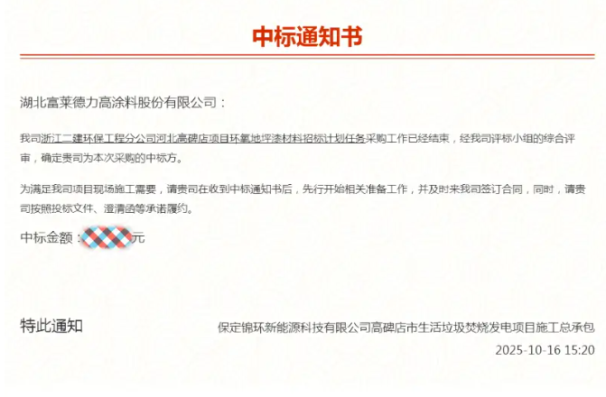 近日,湖北富萊德力高涂料股份有限公司(以下簡稱“富萊德力高涂料”)在激烈的市場競爭中脫穎而出,成功中標保定錦環新能源科技有限公司高碑店市生活垃圾焚燒發電項目的環氧地坪漆材料采購任務。富萊德力高涂料憑借優質的產品性能、完善的技術方案及可靠的履約能力,獲得評標小組的一致認可 。