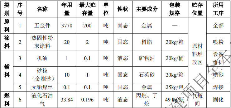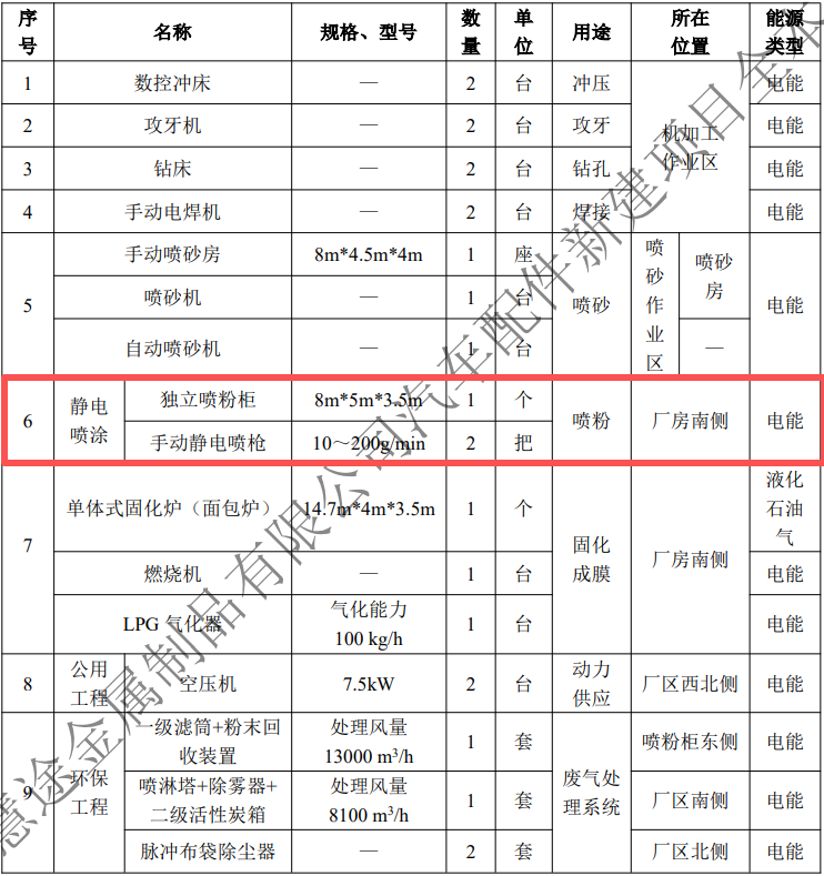 本項(xiàng)目以五金件為原料,以粉末涂料為工藝材料,以液化石油氣為供熱能源,采用機(jī)加 工工藝,靜電噴涂工藝進(jìn)行專業(yè)表面涂裝加工,生產(chǎn)過程不涉及機(jī)械化學(xué)預(yù)處理(酸洗、堿洗、脫脂、水洗等)、轉(zhuǎn)化膜處理(磷化、鈍化、硅烷化、鋯化等)。