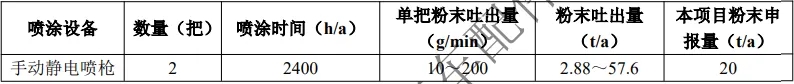 考慮到損耗等情況,本項(xiàng)目按噴涂粉末年用量20t/a申報,滿足項(xiàng)目產(chǎn)品噴涂粉末用量需求。 靜電噴涂生產(chǎn)線產(chǎn)能匹配性分析:本項(xiàng)目不設(shè)置自動噴涂線,故本次不進(jìn)行涂裝設(shè)備匹配性分析,僅進(jìn)行涂料用量匹配性分析。 項(xiàng)目配備1臺手動噴粉柜,人工噴粉柜內(nèi)有2個噴粉工位,每個工位配備1把人工噴槍, 兩側(cè)各1把,合計2把人工噴槍。根據(jù)(“4+2”重點(diǎn)行業(yè)指南):佛山市鋁型材涉表面處理建設(shè)項(xiàng)目環(huán)評文件編制技術(shù)參考指南(試行),進(jìn)行涂料用量匹配性分析:根據(jù)噴 涂設(shè)備供漆量、數(shù)量、噴漆時間校核涂料用量的匹配性。