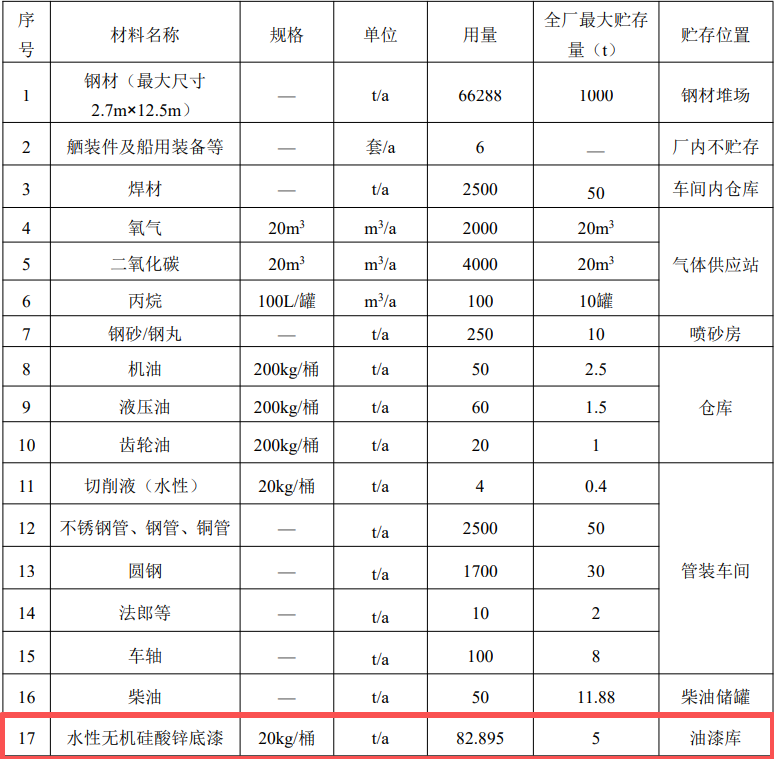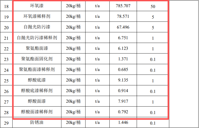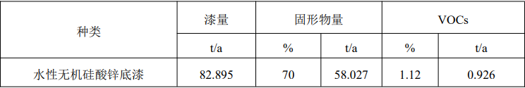 根據(jù)上式計算,油漆理論使用量(包含稀釋劑、固化劑等)分別為環(huán)漆49.971t/a、防污漆10.617ta、聚氨酯面漆1.403ta,企業(yè)提供油漆用量分別為環(huán)氧漆52.029t/a、防污漆10.879ta、聚氨酯面漆1.680ta,本次環(huán)評采用企業(yè)提供的油漆等用量。