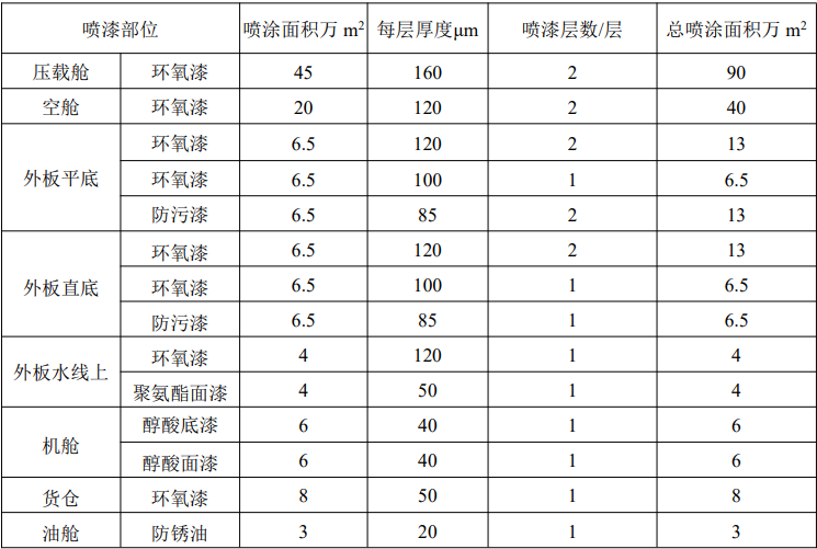 根據(jù)上式計算,油漆理論使用量(包含稀釋劑、固化劑等)分別為環(huán)24.954ta、防污漆5.098ta、聚氨酯面漆0.771ta,根據(jù)現(xiàn)有工程生產(chǎn)經(jīng)驗,企業(yè)提供油漆用量分別為環(huán)氧漆26.643ta、防污漆5.481t/a、聚氨酯面漆0.879ta,本次環(huán)評采用企業(yè)提供的油漆等用量。