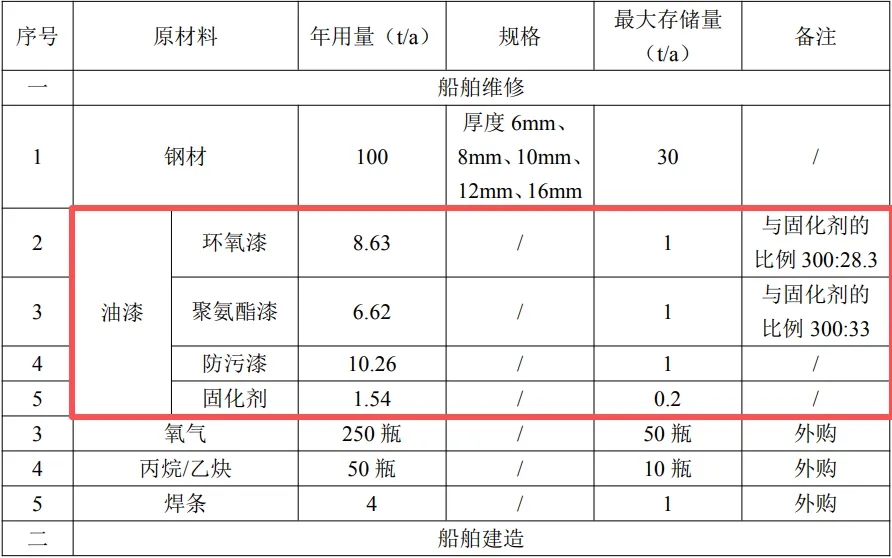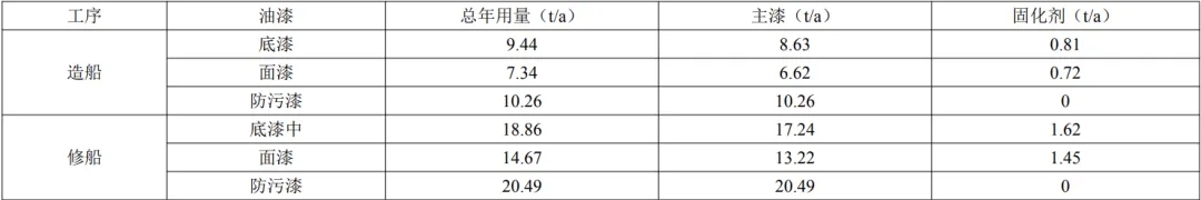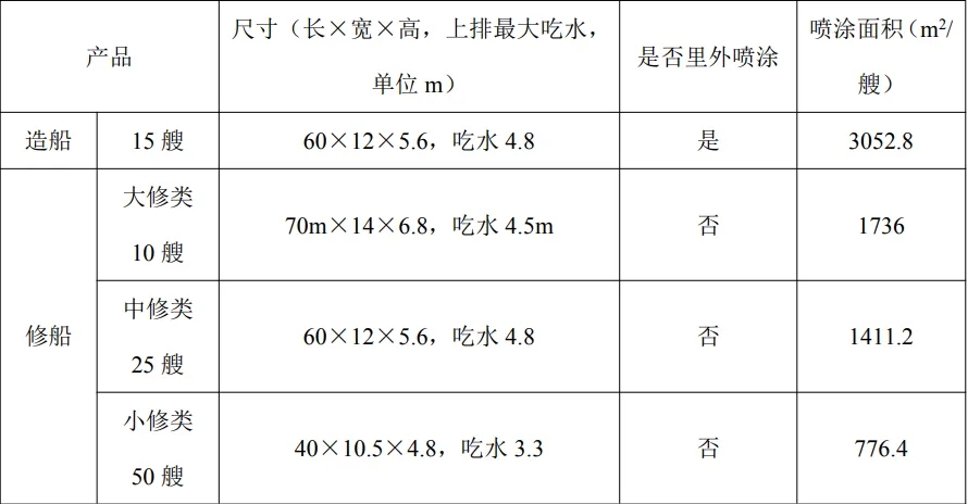 2、修船:本項目維修的船舶主要以海洋工程船舶、漁船、拖輪為主,由于每艘船舶維修需求不一致,一般僅需噴涂生銹部分(即吃水部分船身),本項目按照最大吹水面積進行核算,則大修船舶每艘噴涂面積為70×14+14×4.5×2+70×4.5×2=1736m2.中修船舶每艘噴涂面積為60×12+60×4.8×2+12×4.8×2=1411.2m2.小修船舶每艘噴涂面積為40×10.5+14×3.3 ×2+40×3.3×2=776.4m2.