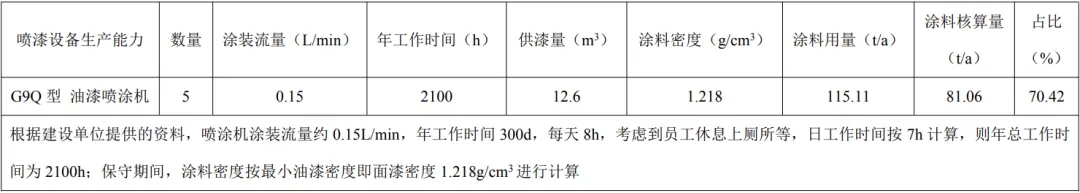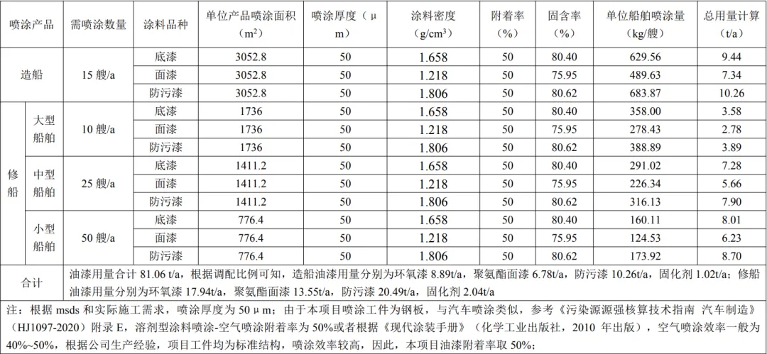 1、造船:本項目船舶建造主要以漁船為主,尺寸為60m×12m×5.6m,上排最大吃水4.8m,整體船身均需要噴漆,船身可近似為一個長方體,噴漆表面為四周和地面,里外均需要噴涂,則每艘漁船噴涂面積為(60×12+60×5.6×2+12×5.6×2)×2=3052.8m2;