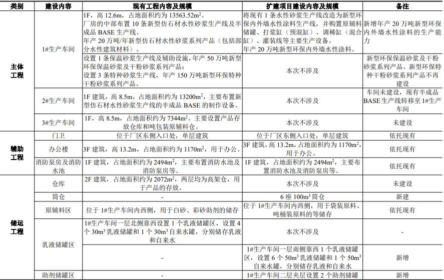 隨著市場發(fā)展需求,立邦新型材料(安徽)有限公司擬實(shí)施“立邦新型材料(安徽) 有限公司水性涂料技改項(xiàng)目”,將現(xiàn)有廠區(qū)內(nèi)1條水性砂漿生產(chǎn)線改造為新型環(huán)保內(nèi)外墻水性涂料生產(chǎn)線,并購置原輔料儲罐、打漿缸(預(yù)混缸)、調(diào)稀缸(混合缸)、灌裝 線等主要生產(chǎn)設(shè)備,改造現(xiàn)有管廊、儲運(yùn)系統(tǒng)等相關(guān)配套公輔設(shè)施。技改擴(kuò)建項(xiàng)目可實(shí) 現(xiàn)新增年產(chǎn)20萬噸新型環(huán)保內(nèi)外墻水性涂料的生產(chǎn)能力。通過調(diào)整工作班制(由單班制 [每班 8h、年工作300天]改為四班三運(yùn)轉(zhuǎn)制[每班8h、年工作300天])、延長現(xiàn)有水性 砂漿生產(chǎn)線運(yùn)行時間(由 2222h/a延長至 6667h/a),保持現(xiàn)有年產(chǎn)20萬噸/年新型仿石 材水性砂漿系列產(chǎn)品(包括部分水性建筑材料)生產(chǎn)能力不變。