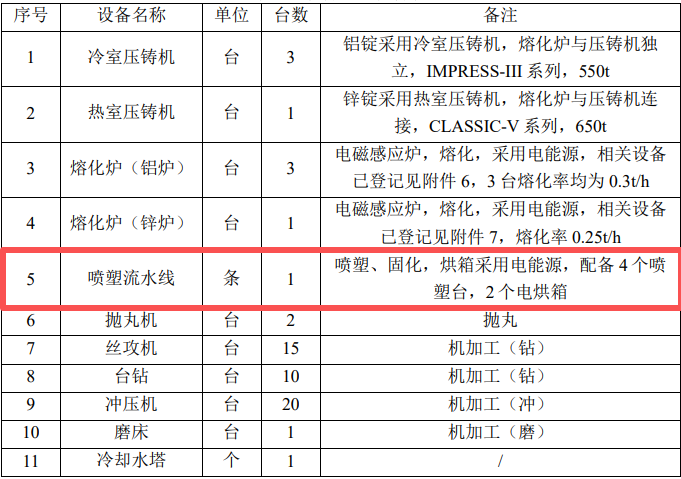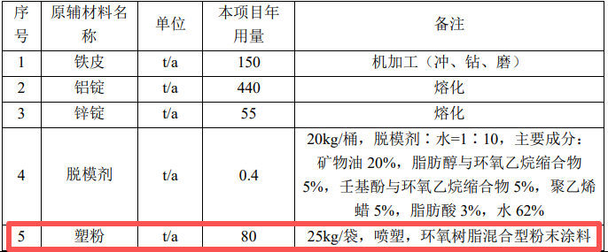 噴塑、固化:根據(jù)客戶需求,部分組件表面需進(jìn)行噴塑處理。將壓鑄 好的組件放入噴臺進(jìn)行噴塑處理,噴臺主要由噴槍、房體、自動回收系統(tǒng)和 供粉系統(tǒng)組成。供粉系統(tǒng)把壓縮空氣與粉筒內(nèi)的粉末充分混合后成為流體狀 并通過粉泵輸送到噴槍中。噴槍的槍體內(nèi)帶有高壓發(fā)生器,它可以在槍尖處產(chǎn)生高達(dá)10萬伏的電壓,將槍尖附近區(qū)域的空氣電離,從噴槍中噴出的粉體 通過該電離區(qū)域時帶上負(fù)電荷,通過電場力的作用粉末被吸附到接地的工件表面,并形成一層厚度約50~60um 的粉膜;在半密閉的噴塑臺內(nèi),風(fēng)機(jī)產(chǎn)生負(fù)壓,將噴塑室內(nèi)未吸附在工件表面的粉體吸入自動回收系統(tǒng),經(jīng)過回收系統(tǒng)回收的塑粉重新利用,系統(tǒng)未回收的粉塵向車間逸散,但由于整體的噴塑 車間是密閉車間,逸散的粉塵部分在車間沉降(約70%在車間沉降,該部分塑粉經(jīng)清掃計入固廢統(tǒng)計),剩余未沉降部分粉塵由工人通過進(jìn)出車間或產(chǎn)品運(yùn) 輸帶出排入外環(huán)境。噴塑過程會產(chǎn)生噴塑粉塵。