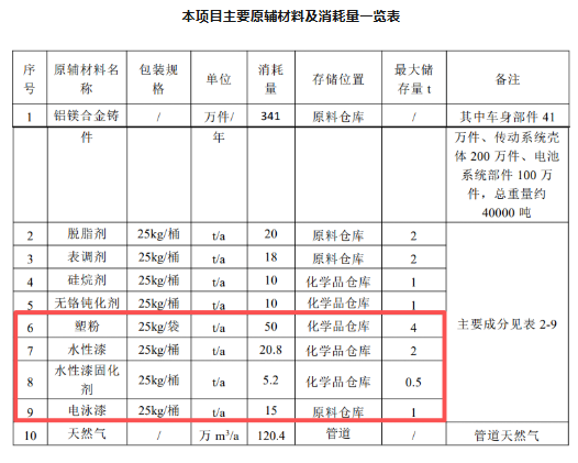 對于電池系統部件,采用的油漆種類為水性漆。其產品平均面積為每套0.2平方米,干膜厚度達到34微米,固含量占比49.16%,涂料密度為1.1克每立方厘米。年噴漆數量為100萬件,上漆率為60%。理論漆量需求為25.36噸每年,而企業提供的用量是26噸每年,判定為合理。