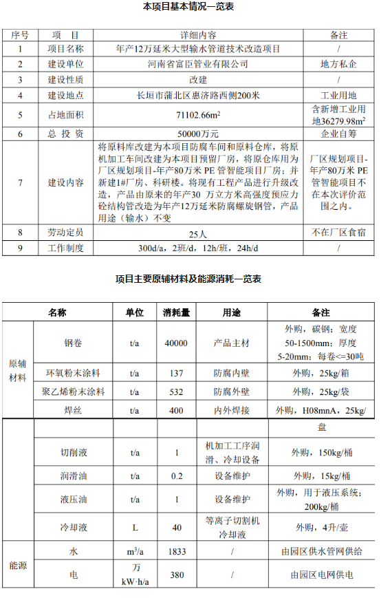 河南省富臣管業(yè)有限公司擬投資50000萬元,引入《年 產(chǎn)12萬延米大型輸水管道技術(shù)改造項目》對現(xiàn)有工程生產(chǎn)工藝及產(chǎn)品進行升級改 造。項目利用原有及新征用地共計106.65畝,項目利用原有及新建 廠房及配套設施30382.47平方 米,建設年產(chǎn)12萬延米。