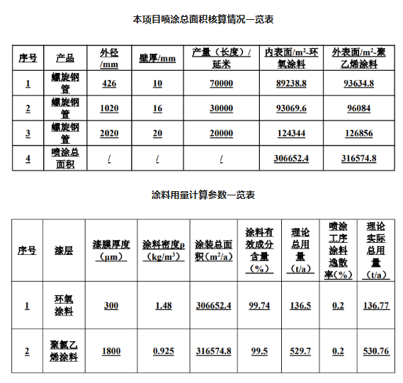 根據(jù)上表可知,環(huán)氧涂料、聚乙烯涂料理論總用量分別為136.5t/a、529.7t/a,又噴涂環(huán)節(jié)為密閉負壓狀態(tài),產(chǎn)生的顆粒物通過收集后,引入脈沖袋式除塵器進行 收塵,收集后的涂料,又會回用于生產(chǎn)。根據(jù)項目源強核算,涂料的逸散率為0.2%, 則項目環(huán)氧涂料、聚乙烯涂料理論實際總用量分別為136.77t/a、530.76t/a。 建設單位提供的環(huán)氧涂料、聚乙烯涂料使用量分別為137t/a、532t/a,與計算所 得環(huán)氧涂料、聚乙烯涂料理論實際總用量差別不大。項目考慮到其他物料損失環(huán)節(jié),如粉料的撒、漏,本次評價采用建設單位提供的涂料使用量數(shù)據(jù)進行評價。