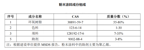 項目采用靜電噴涂方式將粉末涂料吸附于工件表面,再加熱固化轉化為耐久的涂膜。根據供應商提供原料成分,項目粉末涂料主要成分見下表: