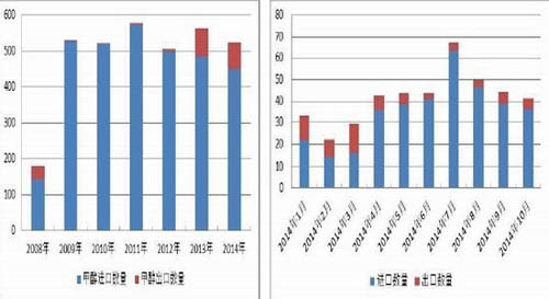 圖 4:2008—2014 年甲醇進口數量變化單位:萬噸圖 5:2014 年甲醇進出口數量單位:萬噸