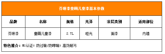這款童畫兒童漆是芬琳漆的頂級環保力作之一,原裝進口、零VOC的同時,半啞光的漆膜光澤度在采光不好的室內,能夠有效提高房間的亮度,讓房間更顯寬敞。